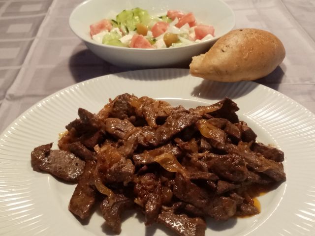 Pražena jetrca, mešana solata, žemljica
