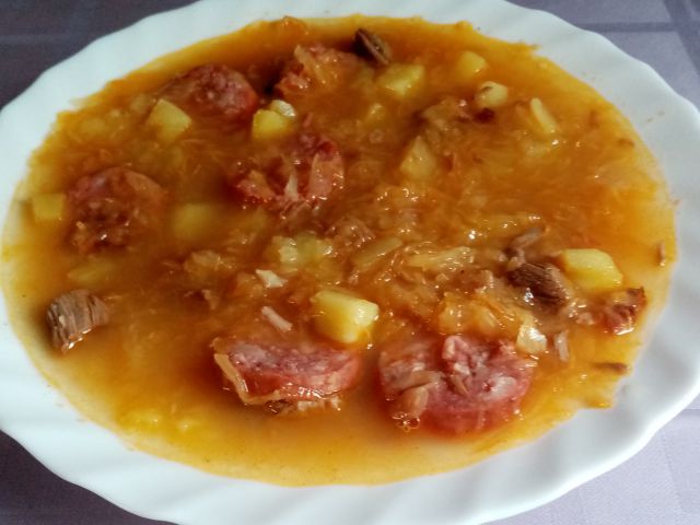 Jota s klobaso (reciklaža kislega zelja, ki je ostal od segedinarja)