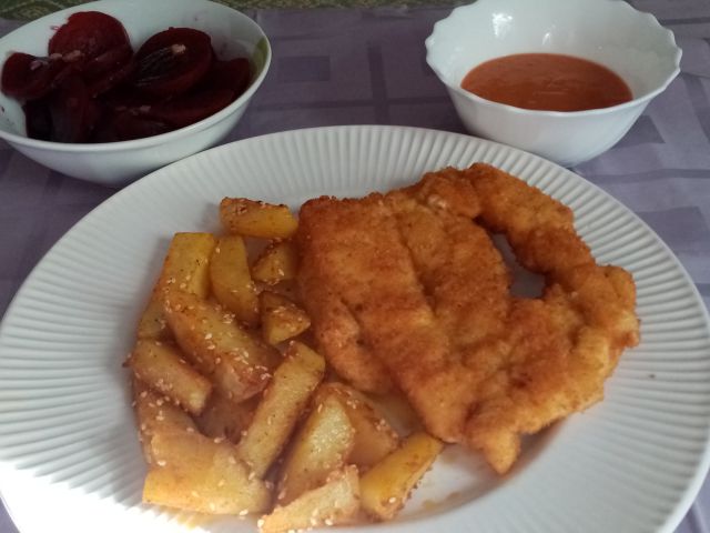 Česnova juhica s krutoni; pečen krompir povaljan v sezamu, panirana piščančja prsa, paradižnikov zos; rdeča pesa