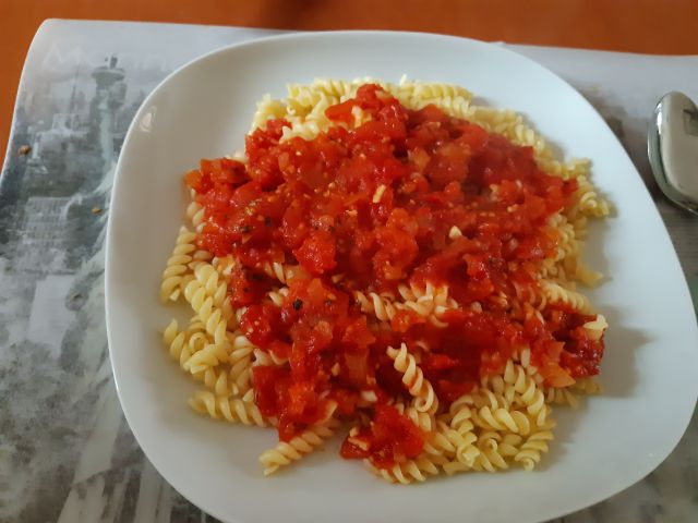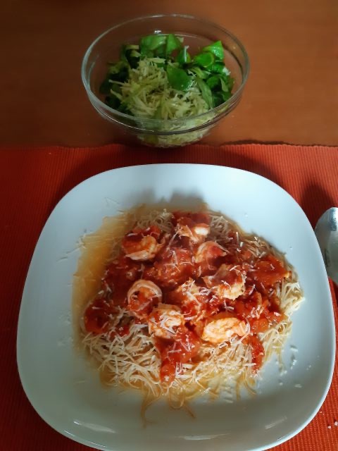 Jaz paradižnikovo omako z gamberi in polnozrnatimi riževimi rezanci