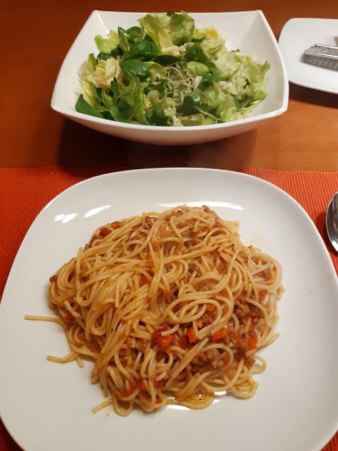 Mož špageti z mesno omako, solata