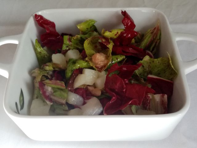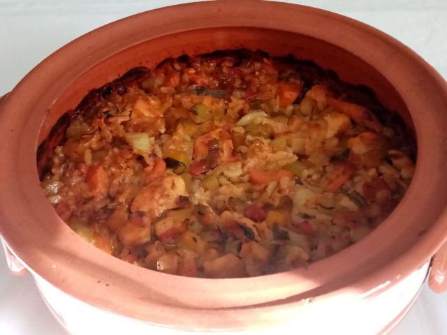 Đuveč, radič s krompirjem in toplimi ocvirki