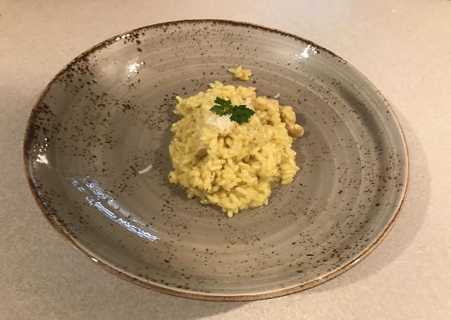 Pri nas je bila danes rizota s piscancem in zafranom, solata in jabolcni zavitek.![]()
