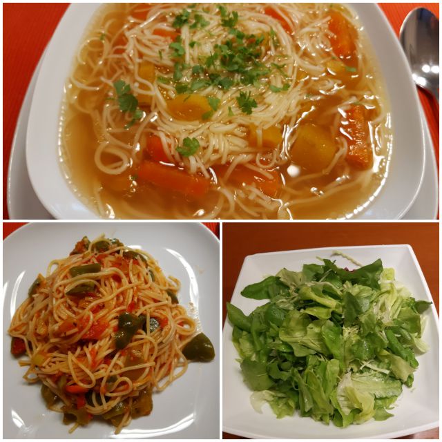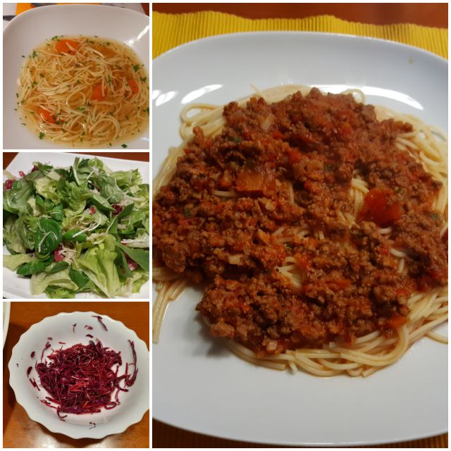 goveja juha z rezanci, špageti z zelenjavno omako, solata