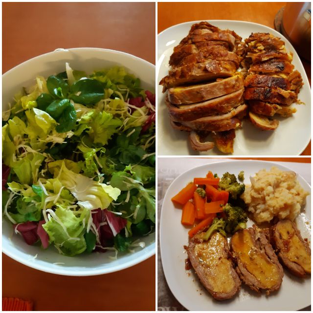 Včeraj polnjena telečja prsa, polnjen sv.zrezek v mrežici, pražen krompir, zelenjava, solata