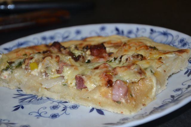 Smo rekli, zakaj neki bi v nedeljo jedli le meso, prilogo? Zakaj ne nekrat nekaj drugega? Pa sem naredila nekakšno pito, Ideja od Ricka Steina, Kitchen24, z njegovega potepanja po Franciji. Malo sem po svoje naredila, a osnova je, kot je opisal on. Kvašeno testo (sicer je podlaga lahko tudi brez kvasa) , prepražena slanina, kisla smetana kot premaz na testu, obročki čebule in po vrhu ementaler. Jaz sem dodala še malo pora in sesekjanega peteršilja, pa del čebule sem prepražila s slanino. Odlično.