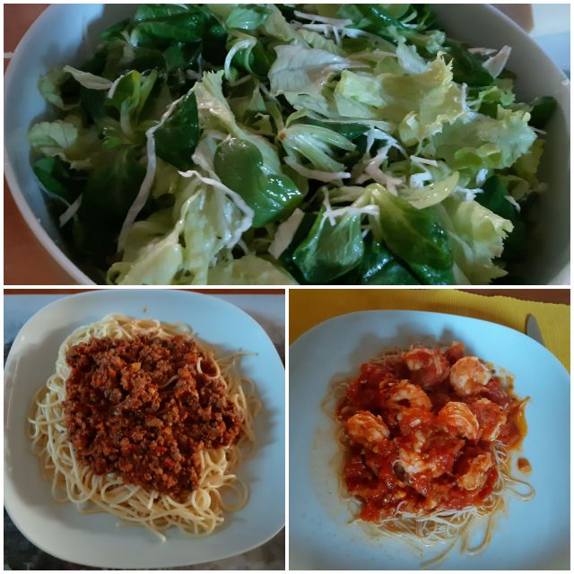 in dolgi sprehod po gozdu...zato mesna omaka iz zaloge, špageti, zame paradižnikova z gamberi, mešana solata