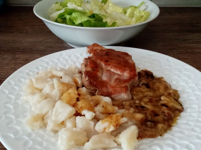 Nedelja: goveja juha s fritati (je bilo potrebno porabit včerajšnje palačinke), piščančji file v sirovo smetanovi omaki, njoki in zelena solata. Za sladico je bil domač vanilijev puding s smetano.