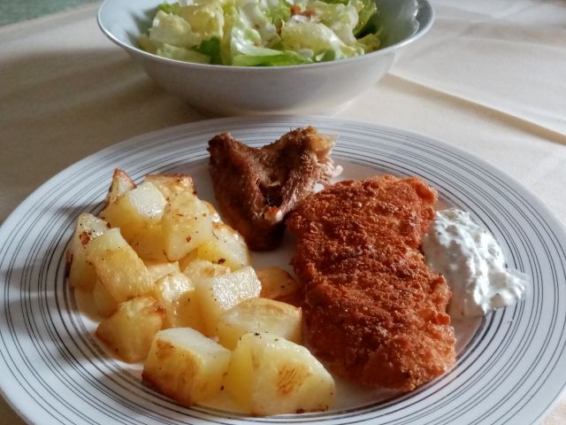 Nedelja: zelenjavna juha (ohrovt, korenje, krompir), pire, špinača in dunajski zrezki.