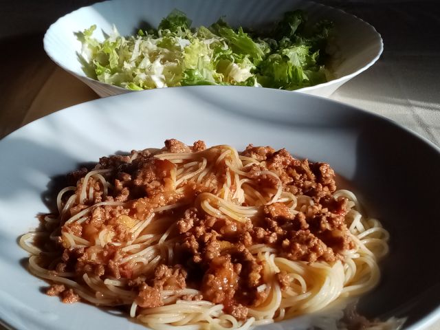 Današnje kosilo omaka mletega mesa s sladko papriko in porom, pa zraven testeninski špageti