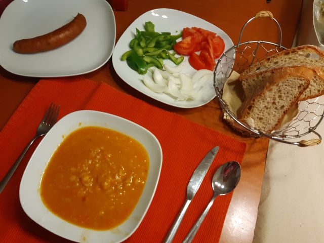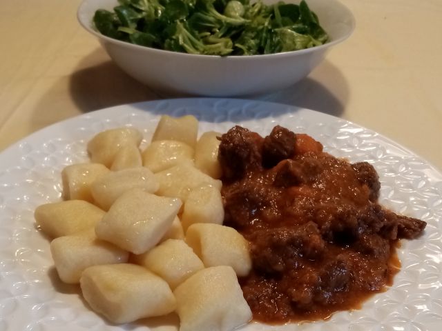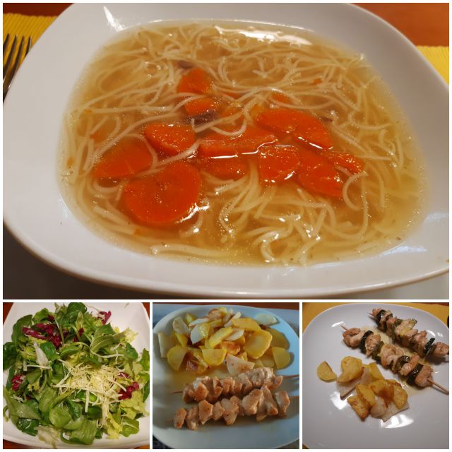 Predvčerajšnjim goveja juha z rezanci, nabodala, krompir, solata