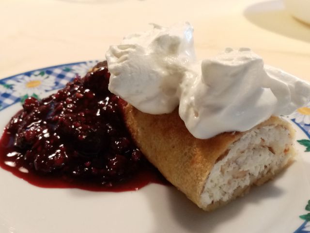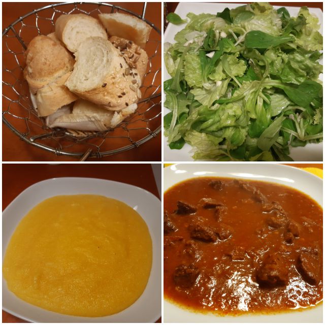 Korenčkova juhica; goveji zrezki v omaki, kruhovi cmoki; zelena/matovilec/zelje na solato; zapečena palačinka prelita z gozdnimi sadeži in sladko smetano