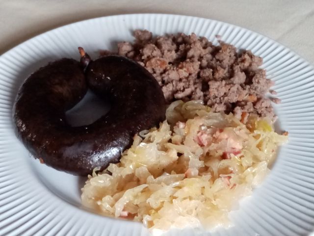 Ajdovi žgančki, dušeno kislo zelje, krvavica
