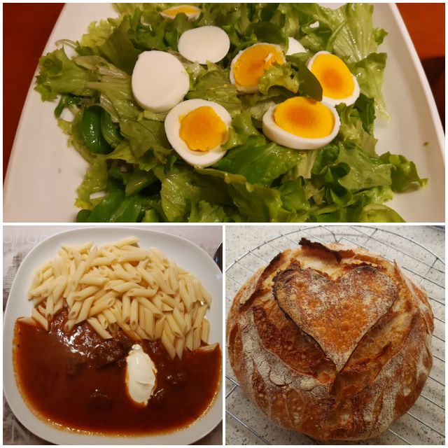 Golaž, testenine, solata in kruh