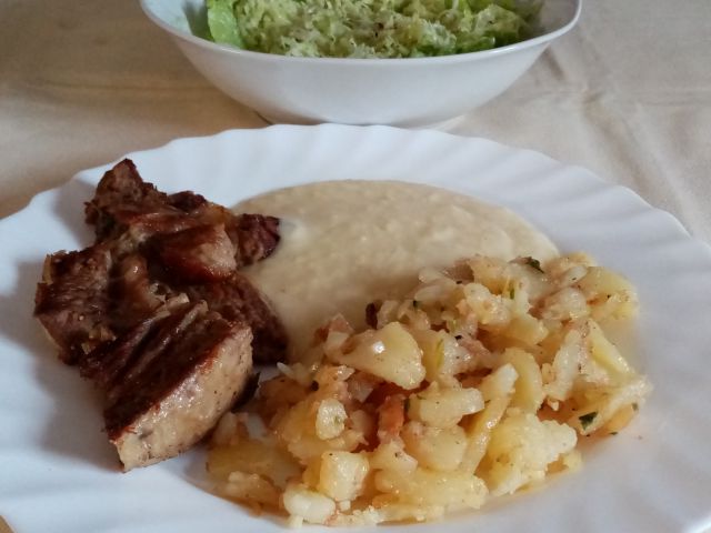Goveja juhica; pražen krompir na ocvirki, popečena govedina, hrenov zos; zeljnato/zelena solata