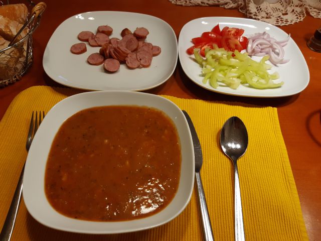 Fižolova juha, kranjska klobasa, drožni kruh.