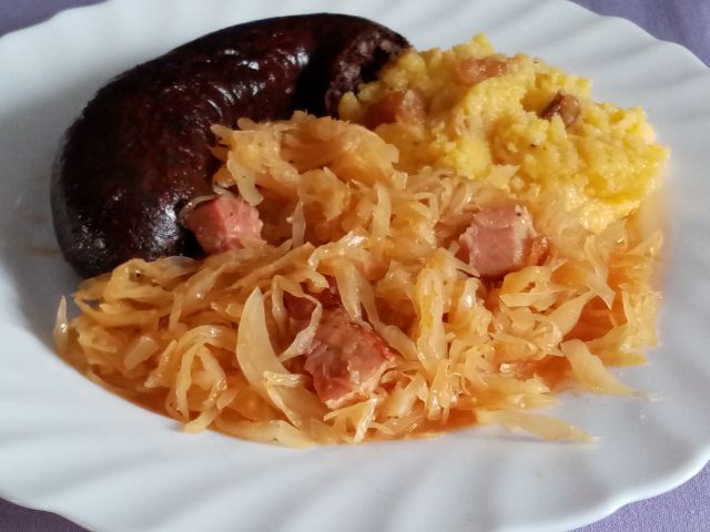 Dušeno kislo zelje, polenta z ocvirki, krvavica