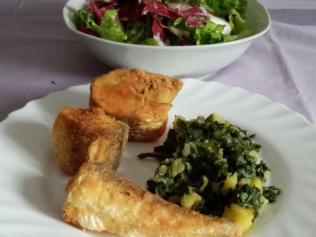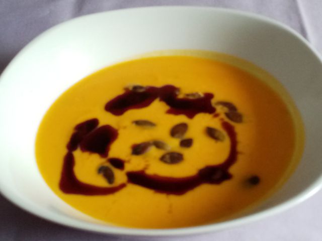 Bučna juhica; Pečen oslič, krompir z blitvo; zelena solata z rdečim radičem