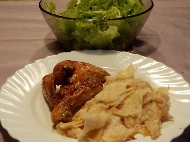 Kostna juhica; pečene perutničke, mlinci; zelena solata