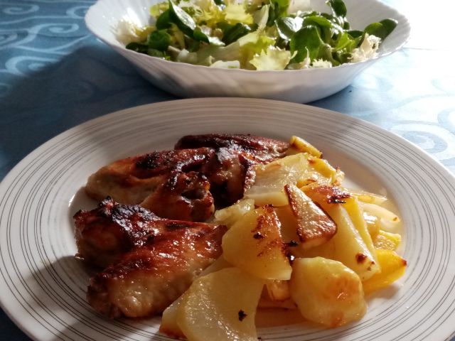 Pečene perutničke s krompirjem; endivija z matovilcem