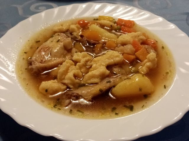 Jesprenjckova juha, file brancina,krompir z maslom, motovilec v solati, ananas, kava, domači piškoti