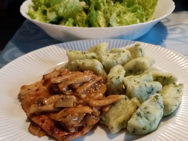 Korenčkova juhica; puranji zrezki, šampinjonova omaka, špinači njoki; zelena solata