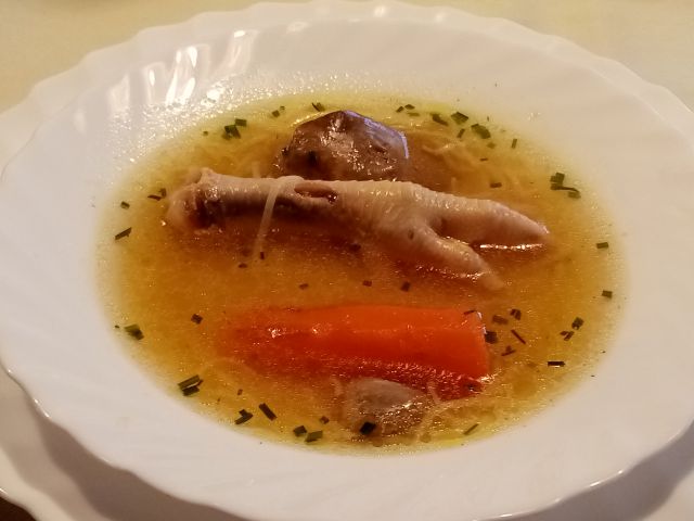 Goveja juha, pečenka, pečen krompir in motovilec z jajci.