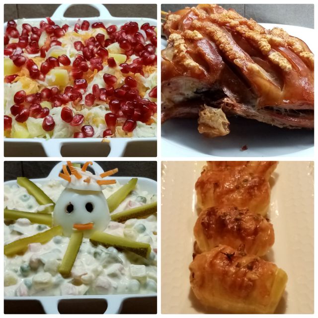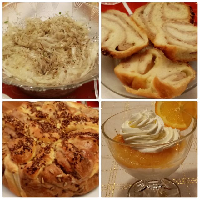 Francoska, zeljnata solata s krompirjem, posuta z granatno jabolko; odojček, zarezan krompir s sirom in slanino; pogača; sadna sladica v kozarcu