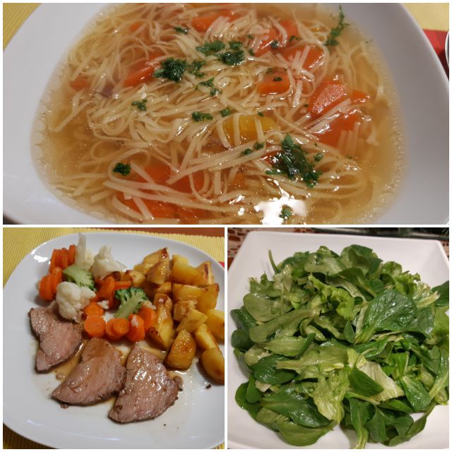 V nedeljo goveja juha z rezanci, telečja pečenka, zelenjava, pečen krompir, solata