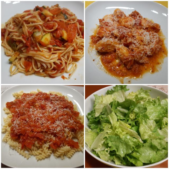 Včeraj bavette z zelenjavno omako za moža, svedrčki s paradižnikovo omako za sina, zame ostanki bučnih njokov s skuto v paradižnikovo omako z gamberi, solata