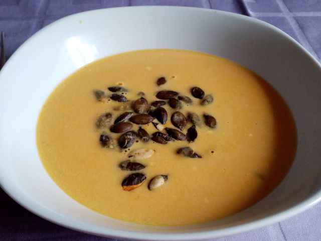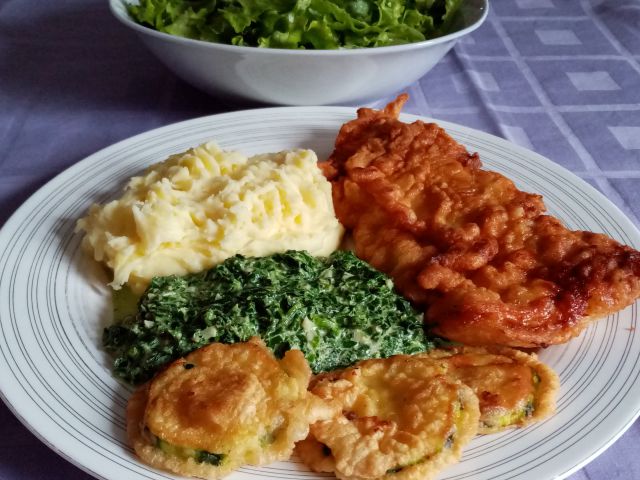 Bučna juhica; pire krompir, špinača, v pivskem testu paniran puranji zrezek, panirane bučke; zelena solata
