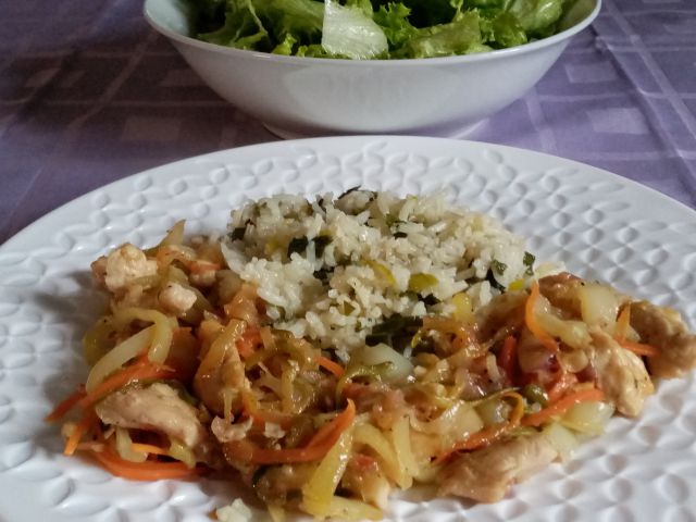 Basmati riž na poru, puranji trakci z mešano zelenjavo; zelena solata
