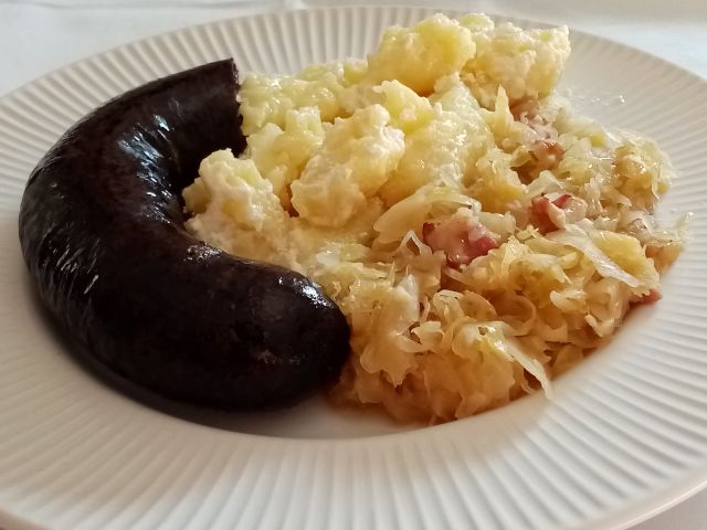 Dušeno kislo zelje, beli žganci zabeljeni s prepraženo čebulo in kislo smetano; krvavica