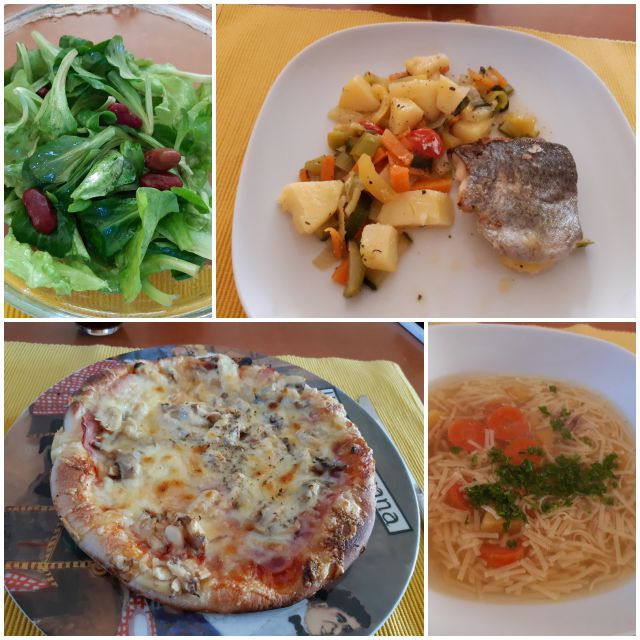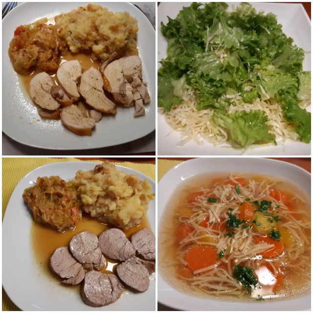 Nedelja, goveja juha, pražen krompir, pečen piščanec, sv. ribica, dušene bučke, solata