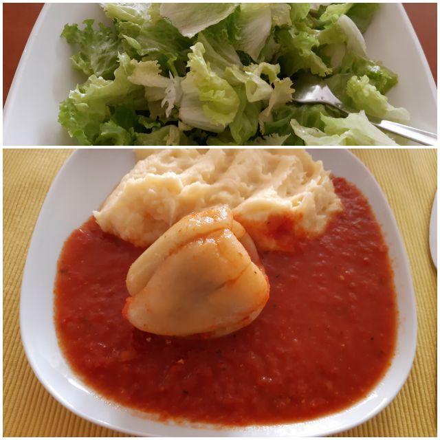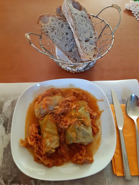 Listi ohrovta (blanširani), nadevani z mletim mesom in proseno kašo, preliti s paradižnikovo omako in pečeno v pečici, priloga krompir v kosih z narezanimi ohrovtovimi listi, maslom in česnom ter sveže pečene štručke z drožmi in sezamom. Sladica jabolčni zavitek. ![]()