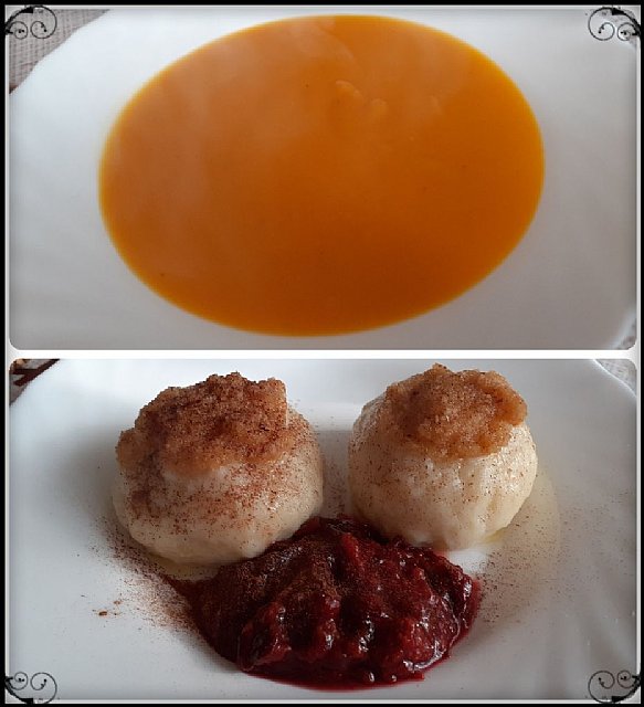 Bučna juha, slivovi cmoki s krompirjevim testom in poleg "omaka", skuhana iz sliv (pač ne tako dolgo kuhano, da bi postala že marmelada). ![]()