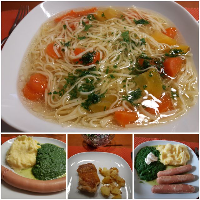 Pri nas danes goveja juha z rezanci, špinača, pire, hrenovke, zame kos piščanca, solata z rdečim in navadnim zeljem