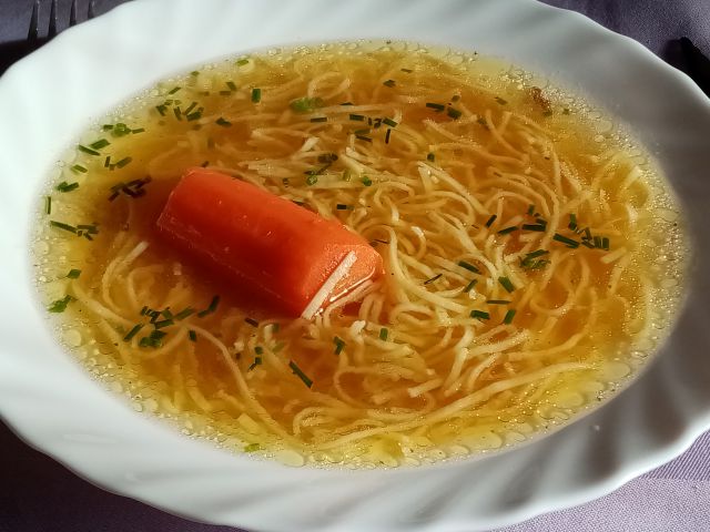 Goveja juha, cel piščanec, pražen krompir in radič.
