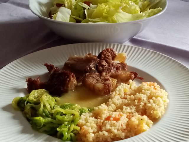Goveja juhica; bulgur s korenčkom, bučkini rezanci v voku, popečena gov. iz juhe, vinska omaka; štrucar, zelje s fižolom