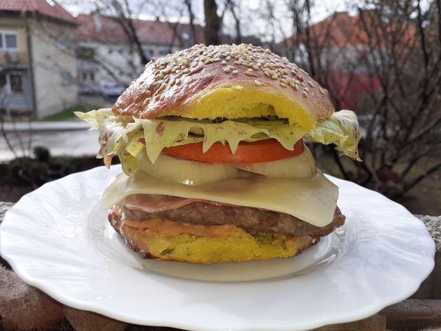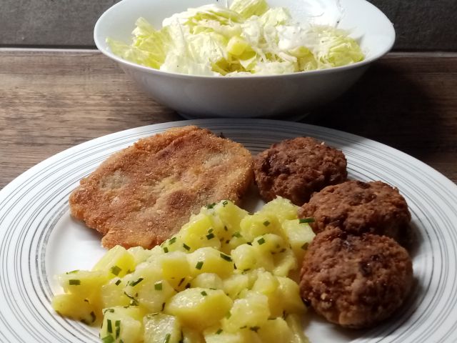 Goveja juhica (od včeraj) ; Masleni krompir, faširanci, panirana paprika nadevana s sirom in slanino; zeljnata solata in štrucar; črno/rumeno pecivo