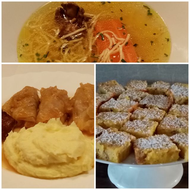Goveja juha s kašo, pečenice, repa, ajdovi žganci, krof, kava