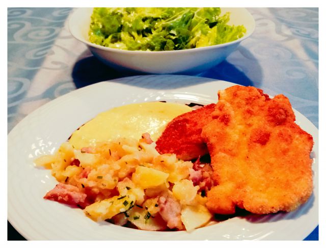Pražen krompir, panirani pišč. zrezki, hrenovo-kumarična omaka; zelena solata