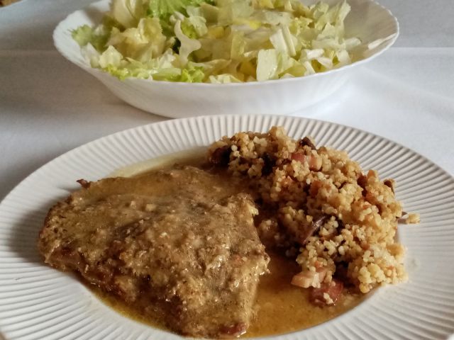 Goveji zrezki v omaki, bulgur na slanini in šampinjonih; štrucar s krompirjem.