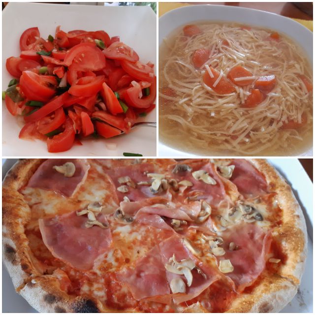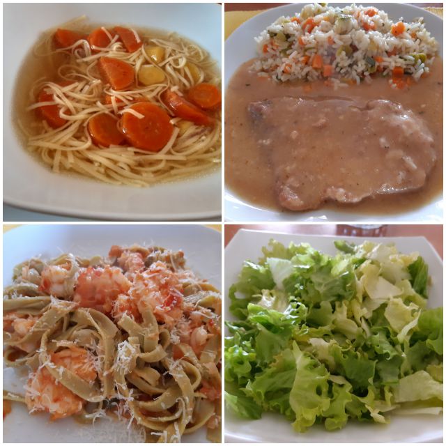 V soboto goveja juha, za moja zrezek v omaki, zelenjavni riž, zame rezanci s škampi in kozicami, solata