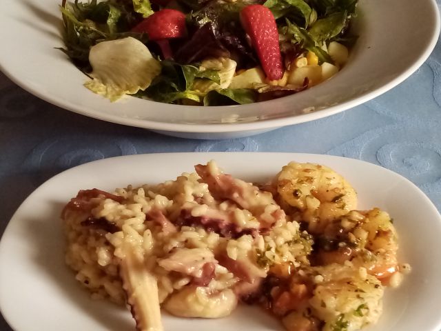 Rižoto z lignji, kozice na česnu in vinu; večbarvni radič s krompirjem in koruzo