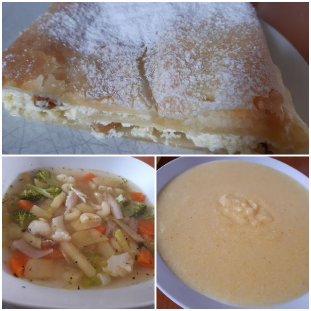 Včeraj zelenjavna juha, polenta, skutin zavitek