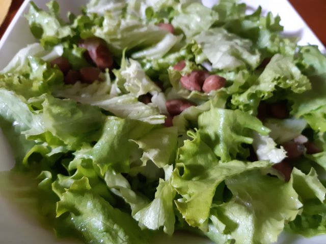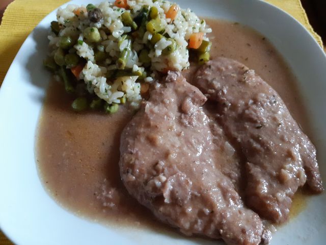 Danes zrezki v omaki, rižota z beluši, grahom, korenčkom, solata s fižolom