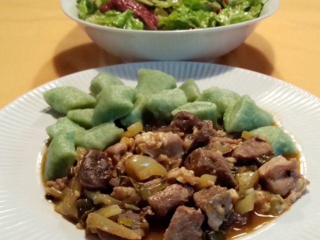 Tri vrste mesa na poru in papriki, podlito z vinom, pokrito s sirom ter pečeno v pečici, zeleni njoki; mešana solata
