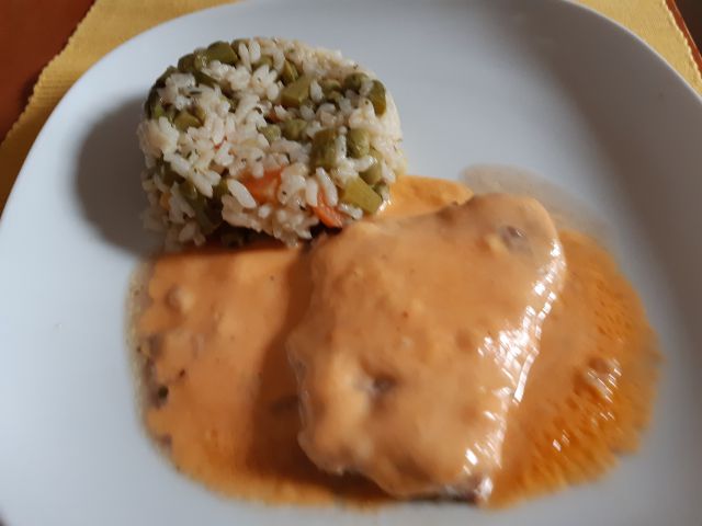 Predvčerajšnjim za sina mesni tortelini s sirovo omako, zame zrezek s sirovo omako in ostanek rižote, za moža kislo zelje v solati in hrenovka.