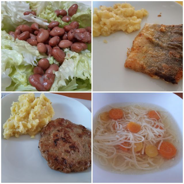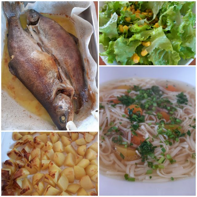 Danes s skupnimi močmi odlično kosilo.. goveja juha s pirinimi rezanci, pražen krompir, domači polpeti, file postrvi, ledenka s fižolom